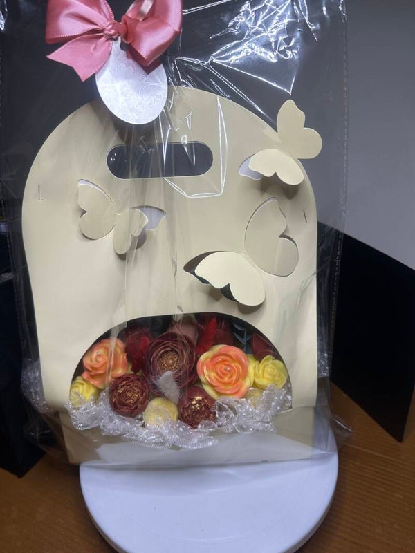 A delicate handcrafted floral arrangement presented in a soft cream gift bag with butterfly cutouts. Inside, vibrant wax flowers in warm shades of rose, amber, and yellow rest on a lace base, creating a refined decorative accent. Finished with a pink satin bow and elegant tag, this design blends natural beauty and artistic detail. Ideal as a gift or as home décor, it offers a lasting alternative to fresh flowers.