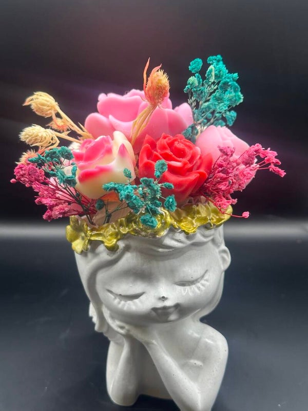 Handmade decorative piece. Each figure is made from gypsum and topped with scented wax flowers that can also be used as wax melts. The arrangement includes hand-poured soy wax blooms, dried botanicals, and metallic accents.
