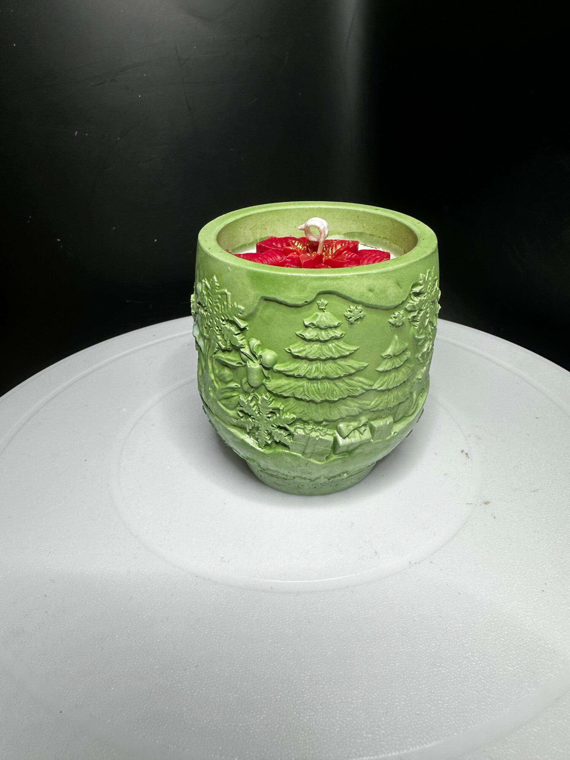Handmade soy wax candle in a festive green gypsum pot embossed with Christmas trees and snowflakes. The candle is topped with a detailed red poinsettia flower, adding a classic holiday touch. It burns clean and evenly, filling your home with a gentle seasonal scent. Perfect as a Christmas decoration or a thoughtful handmade gift.